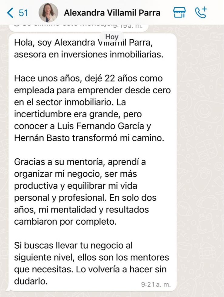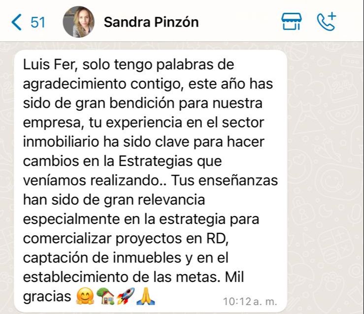 Entrenador en Productividad Inmobiliaria. Ha formado miles de personas en Latinoamérica, y Estados Unidos; Por 7 años ocupó varios roles de liderazgo junto a una de las compañías más grandes de la industria. Construyó un equipo de 120 inmobiliarios en Cali, que en 4 años lograron 851 ventas por $170 mil millones de pesos.